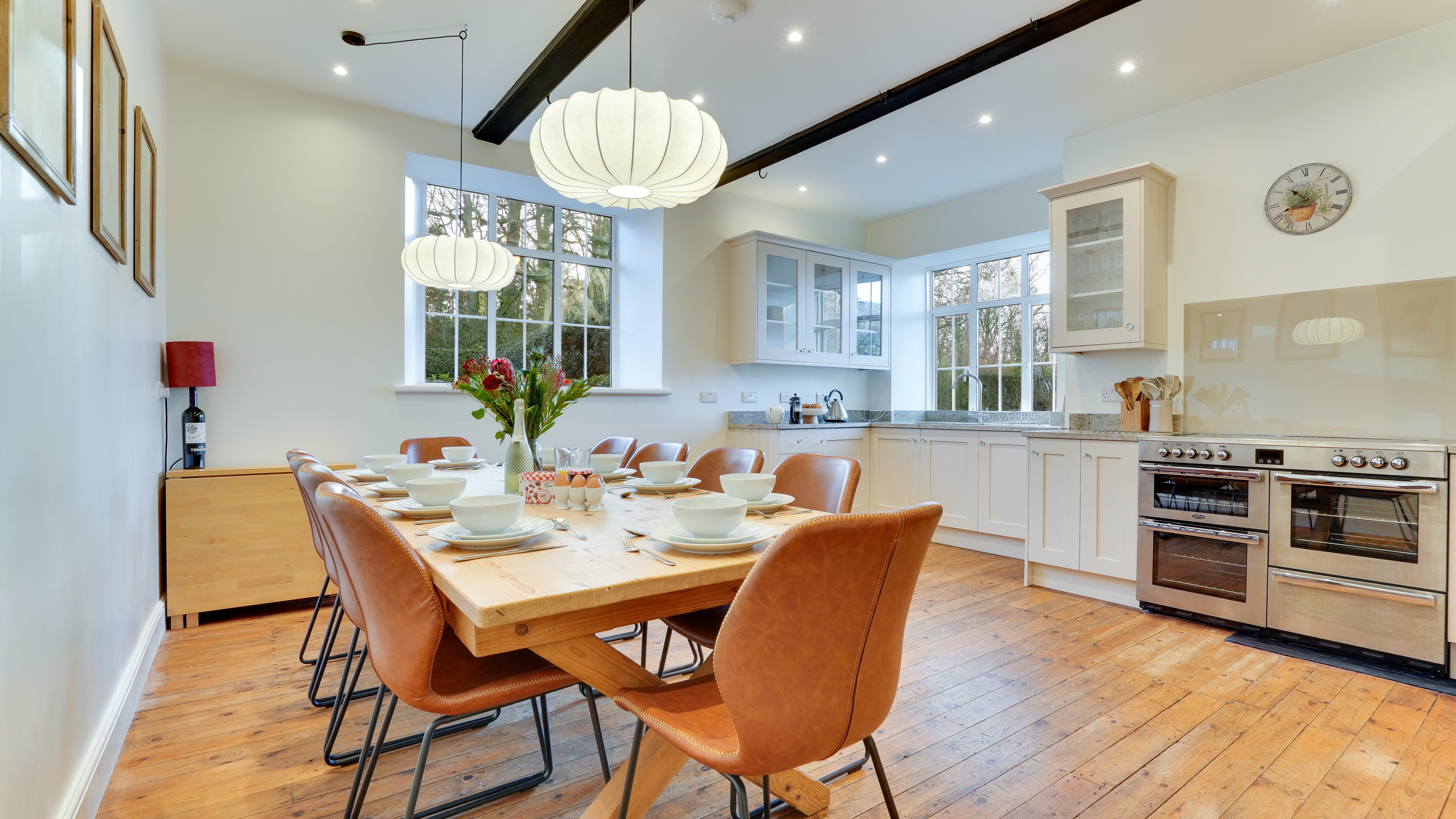 Large kitchen/ diner, range cooker, American-style fridge-freezer. Main kitchen can seat up to 20 around the kitchen table.